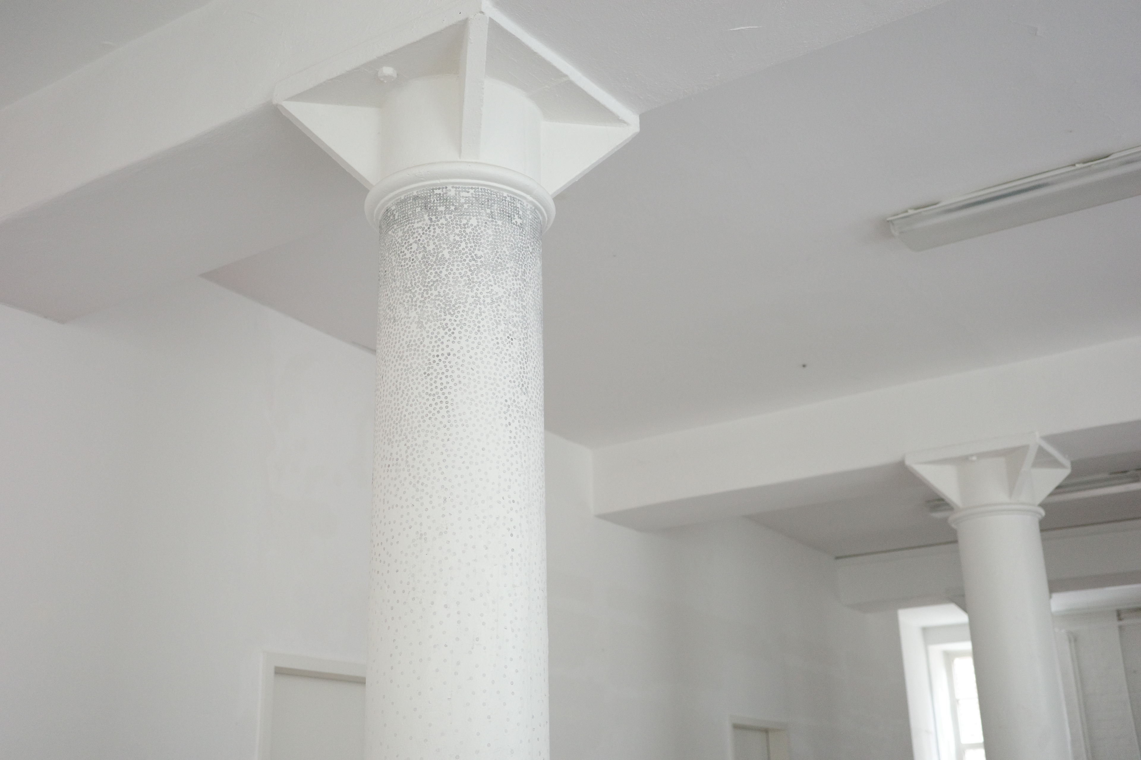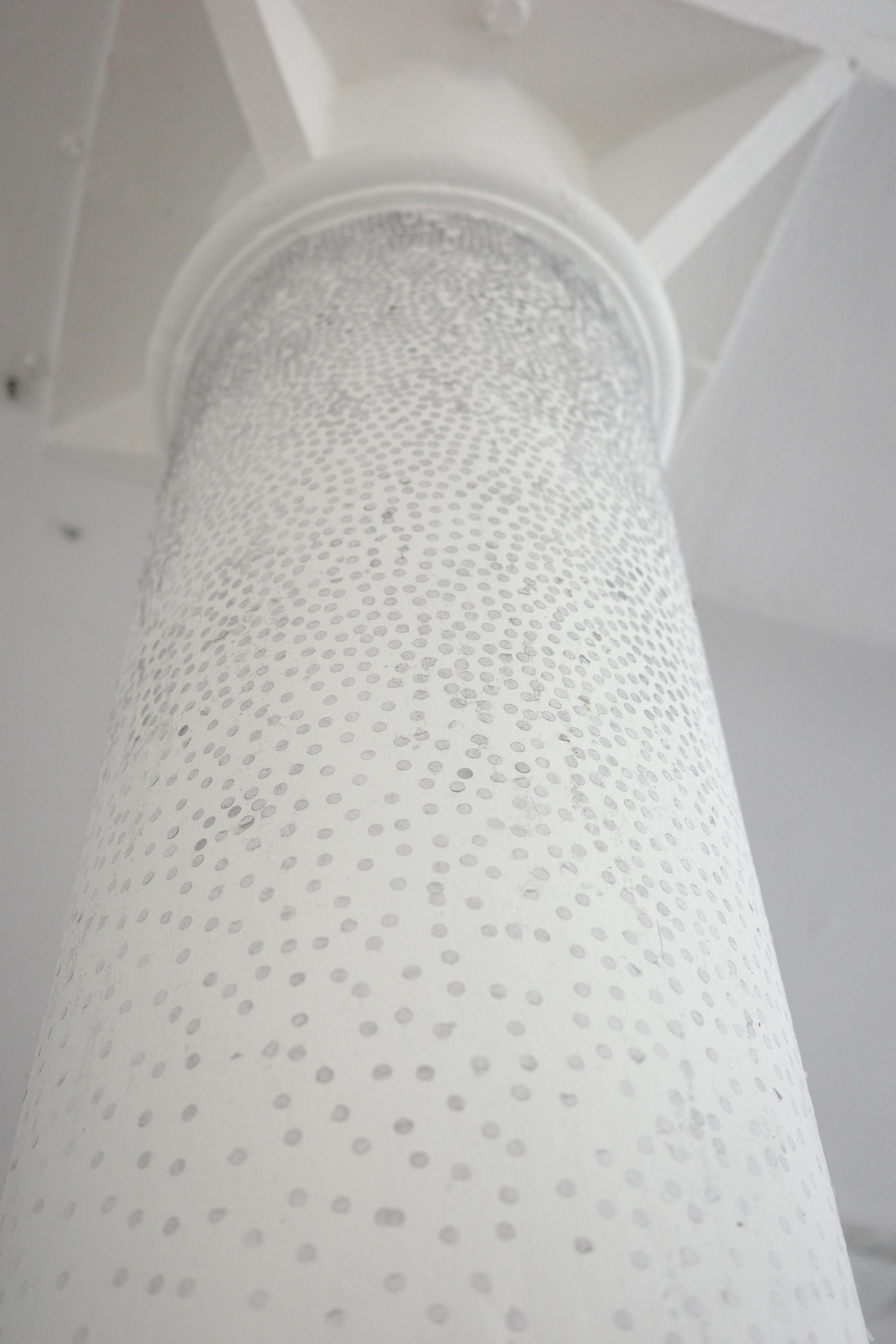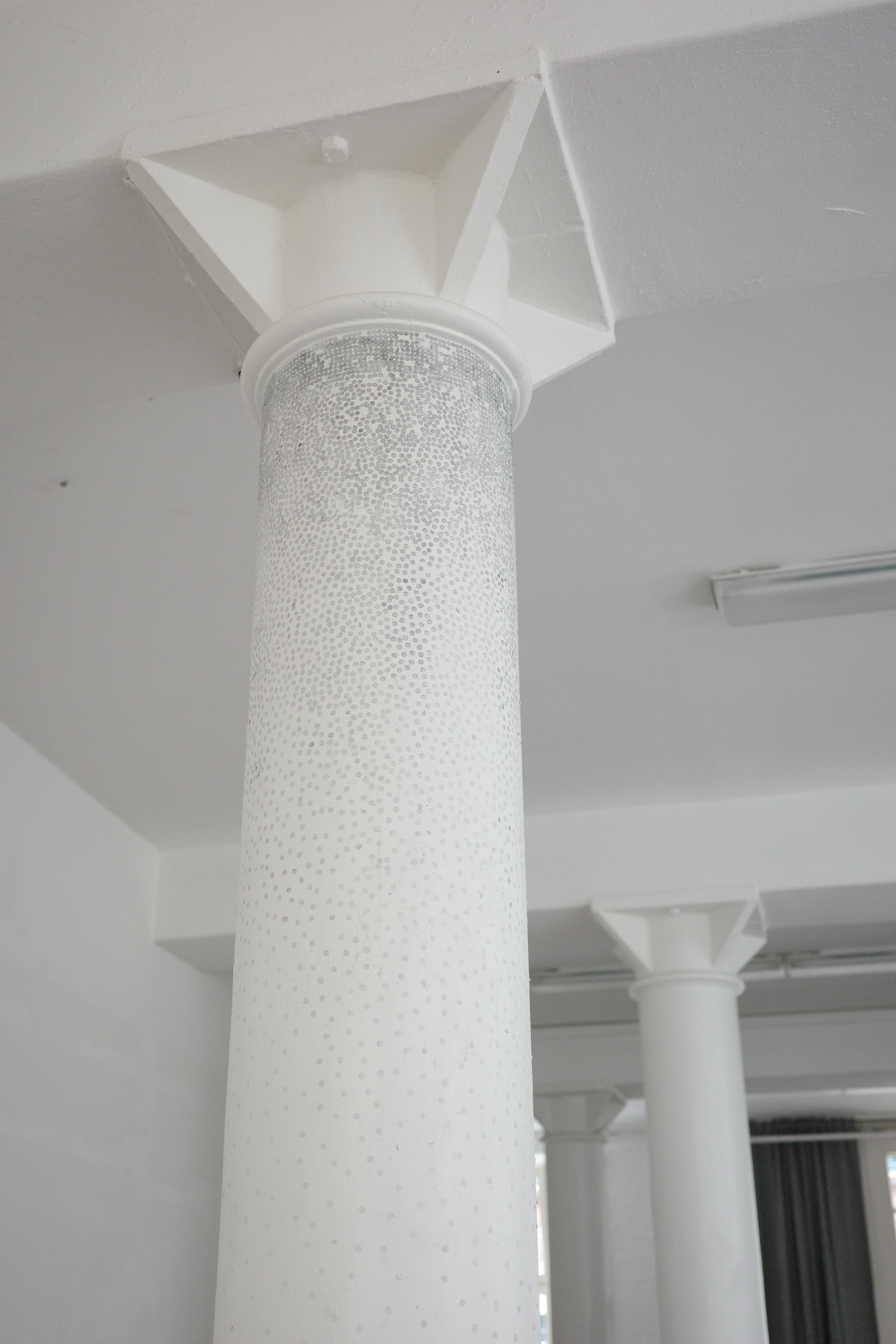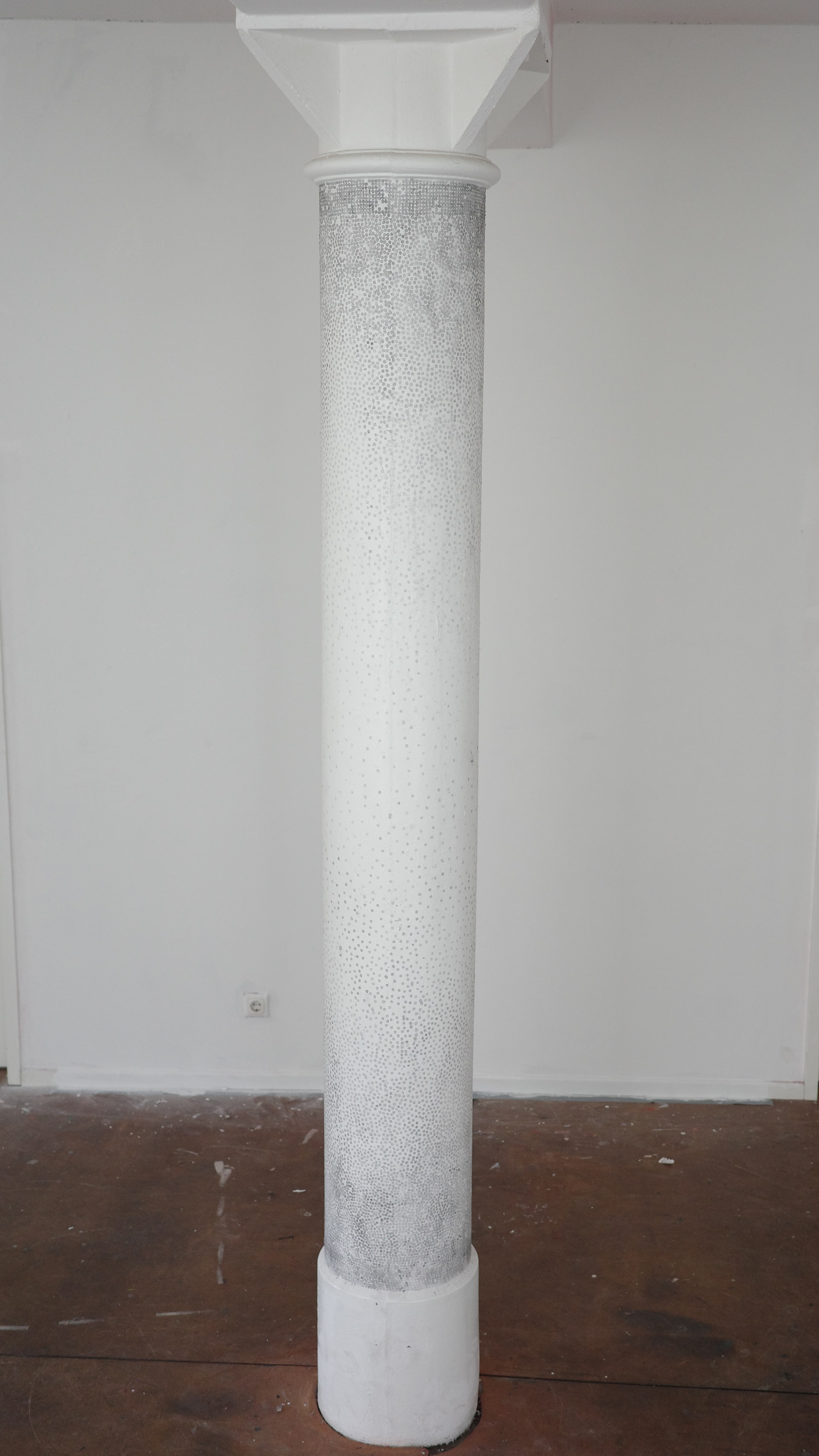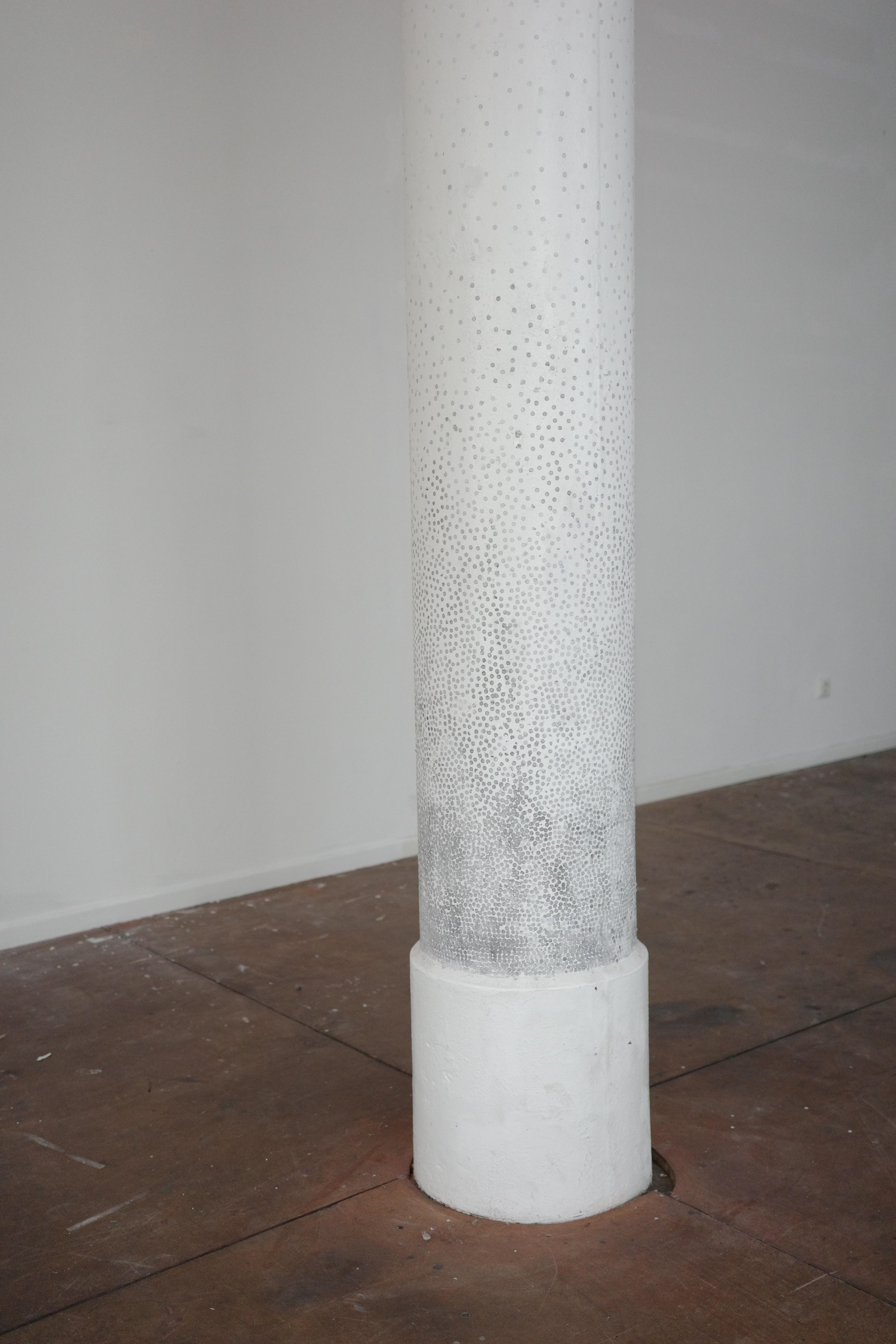 This work was inspired by some black mould which was growing from the corner of my room a year prior. I found it interesting how the mould accentuated the depth of the rooms corner. As an avid drawer, it reminded me of how I might accentuate depth in a drawing through shading. In this project I utilise hole punched pieces of paper, graphite wash, and natural glue to 'shade' an architectural feature in my studio: a pillar.