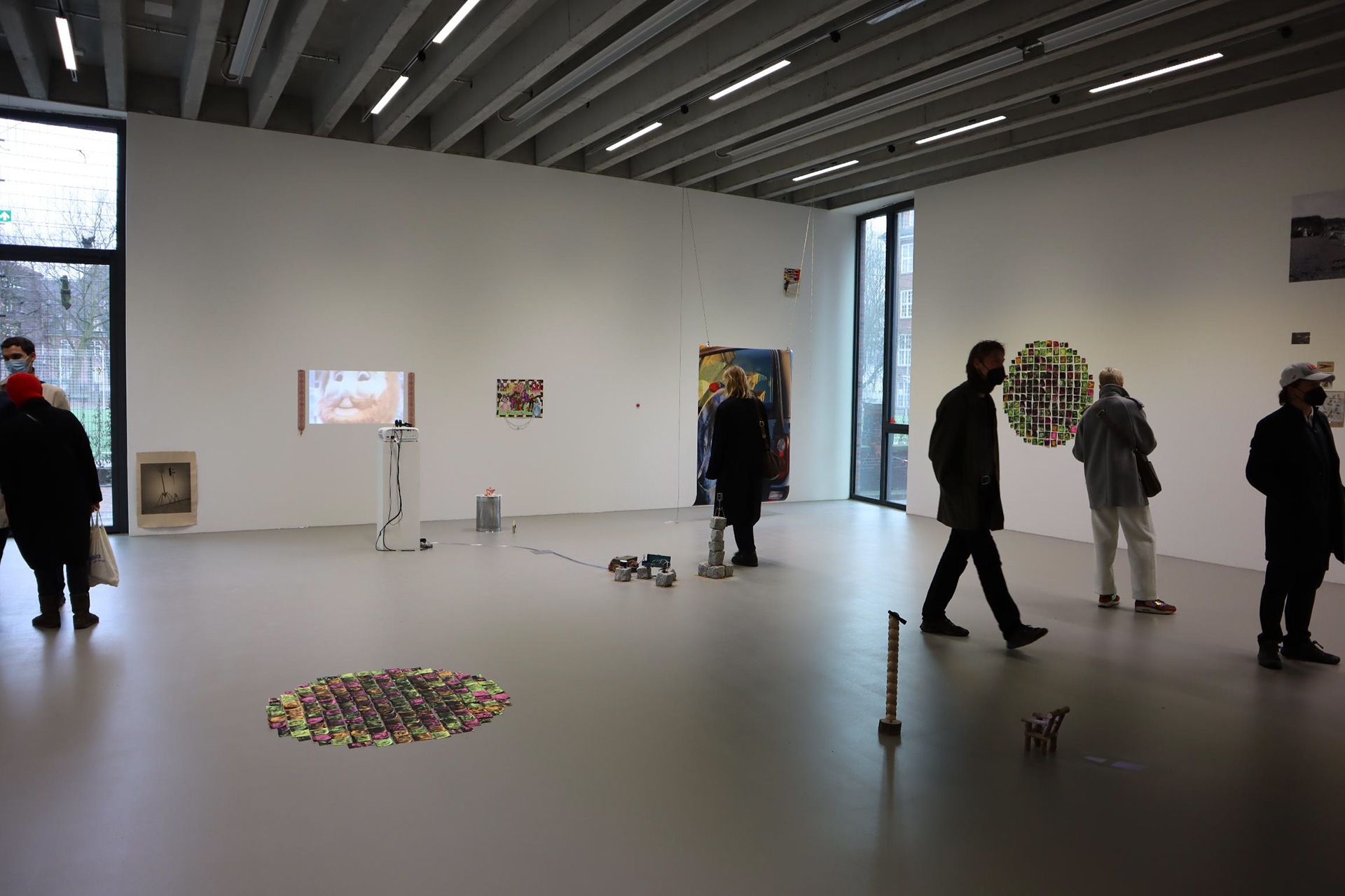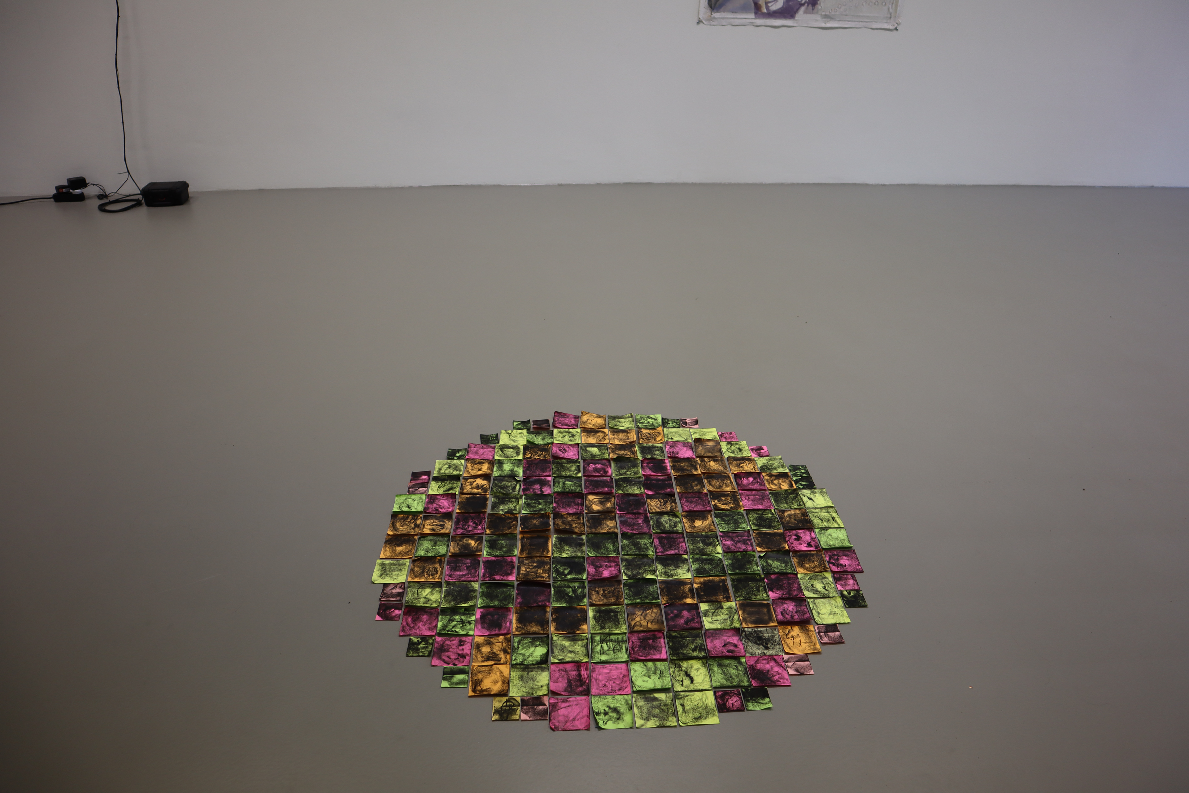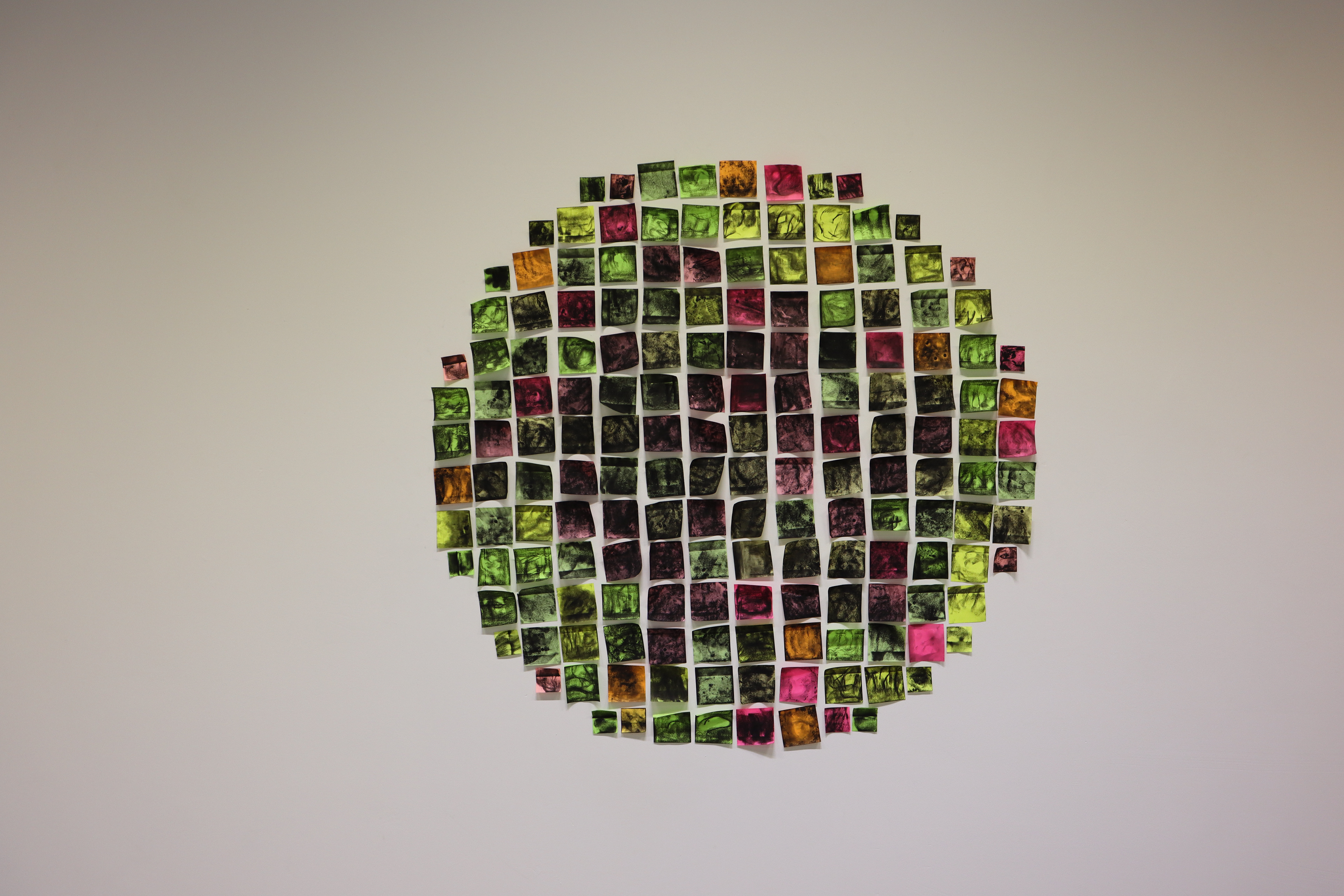 The drawings on post-it notes present bizarre landscape; the frottage of the 'sticky-side', creates an image representative of land and sky. By placing these post-it notes in circles on the wall and floor of the gallery, pixelated portals are created.