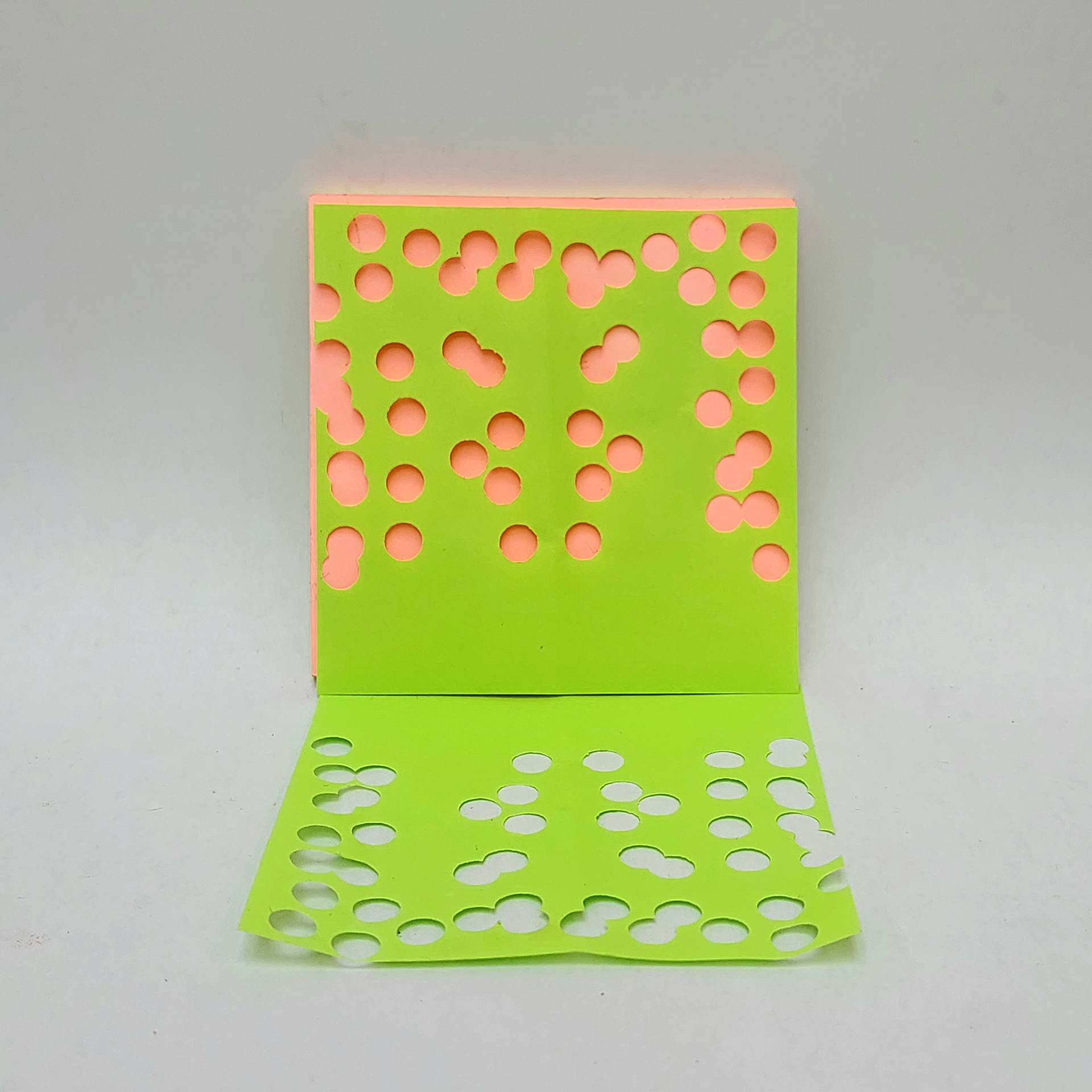Utilising the strange colours of post-it notes and a pattern made using a hole-punch, an alien-like quality emerges from these office materials.